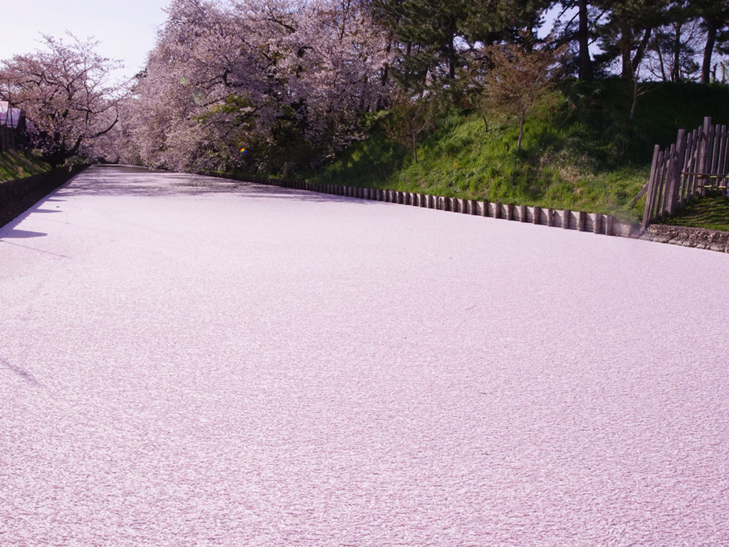 弘前公園の桜が散ると公園の周りの堀を桜の花びらが埋め尽くします。